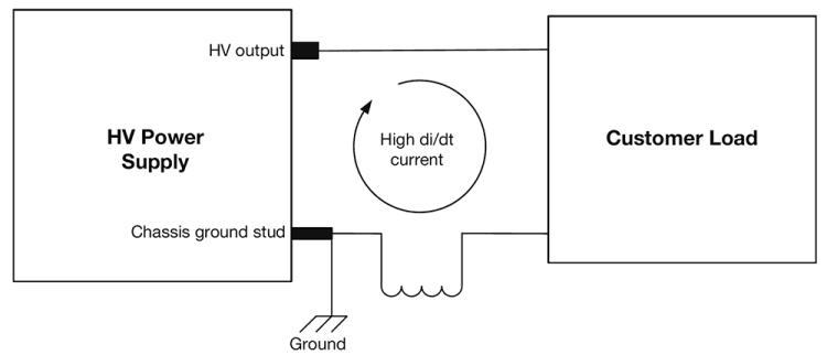 The HV load return, besides carrying load return current, also carries high peak discharge currents caused by arc discharges within the application’s load. When a HV power supply is quickly discharged, the stored energy inside the power supply is discharged through an internal limiting resistance. Since this resistance cannot be very high without degrading specifications or dissipating excessive power and heat, the peak currents are typically high, although of short duration.