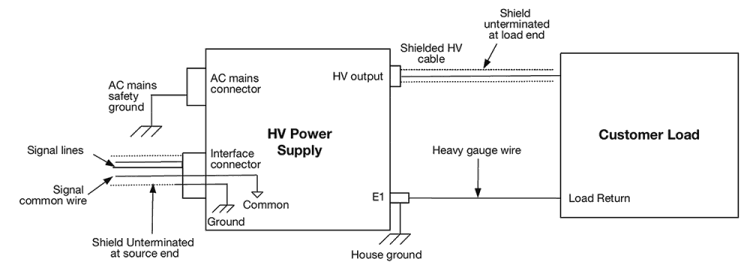 The shield of the HV cable should not be terminated at the load end but should be cut off and covered. The recommended wire gauge for the load return wire is a function of the type of load but should generally be heavier than #6 AWG. Finally, the interface signal commons should be isolated from ground.