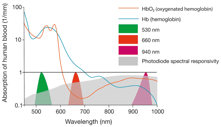 The absorption of light in human blood is primarily dependant on the oxygen content of the haemoglobin. There is more absorption occurring at shorter wavelengths (from blue to yellow), which indicates that green light works the best for heart measurement applications. Red and infrared light can be used for areas that have a higher arterial blood concentration, such as the fingertips, ears, and forehead.
