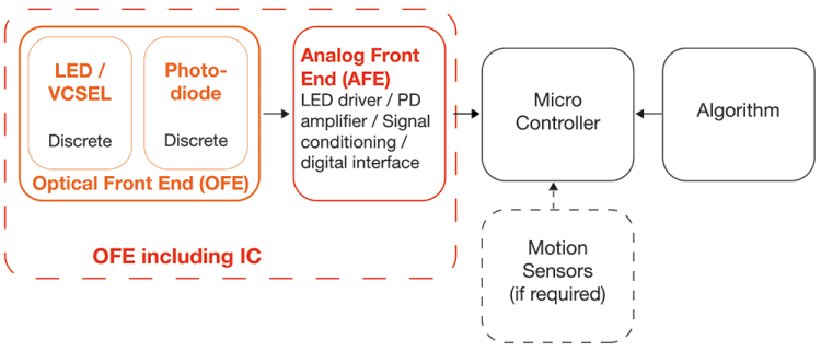 The entire health monitoring system consists of various functional building blocks. The optical front end (OFE) can be realised through discrete components (LEDs and photodiodes) or with an integrated module. The analog front end (AFE) provides the analog signal processing and programmable LED driving.