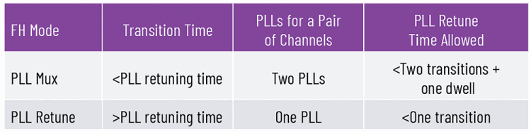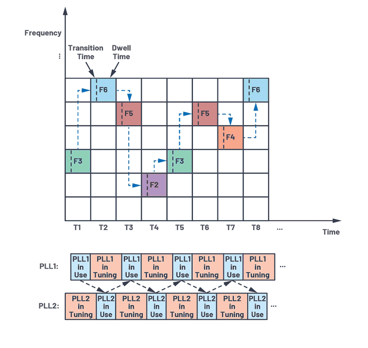 To achieve faster FH with a shorter transition time (shorter than the channel setup time and required PLL tuning time), two PLLs are employed in the device (PLL mux mode). The two PLLs coordinate with each other in a ping-pong fashion: while one PLL is used for the current frequency, the other PLL is retuned to the next frequency. This makes very fast FH possible and could significantly reduce the required transition time between different frequency changes. These two modes are summarised in Table 1. As shown, the selection of these two modes depends on the transition time the user defines.