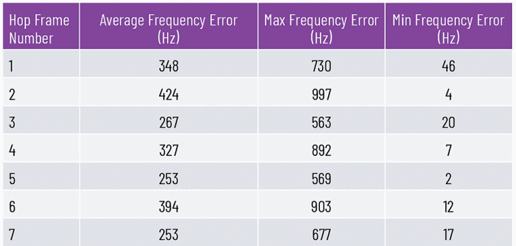 Further measurements are performed to study the frequency accuracy of the Link 16 FH using more advanced test equipment such as Keysight Technologies’ E5052B and the Rohde & Schwarz FSWP. In the example measurement shown in Table 3, the transmit carrier frequency is hopping at 400 MHz, 400,1 MHz, 400,2 MHz and 400,3 MHz. The transmit input is constructed to produce 400 MHz output for all the hop frames.