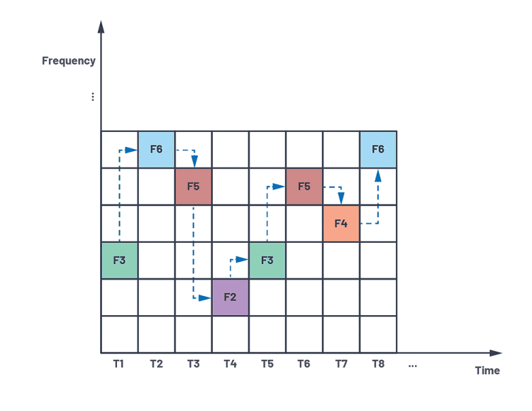 The high-level concept of FH is illustrated in Figure 1. The entire frequency band and time duration are divided into two-dimensional grids. At any given time slot, a different frequency sub-band is utilised for communication. This brings the benefit of high resistance to narrowband interference and strong capability in combating malicious interception and jamming, since the randomness of the hopping pattern equivalently adds another layer of security that is only decodable between the transmitter and receiver.