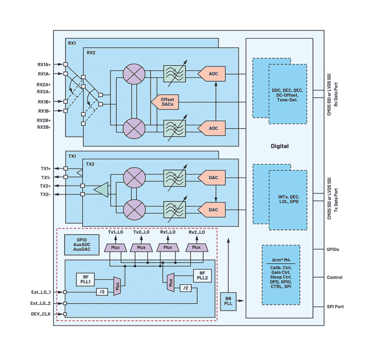 Figure 2 depicts a high-level block diagram of the ADRV9002. It includes dual transmit and receive channels with a set of advanced digital signal processing algorithms. The phase locked loop (PLL) structure inside the red dashed box is unique in the sense that instead of having one dedicated PLL for the receive data path and one for the transmit data path as many other transceivers do, two RF PLLs are employed in the device and both can optionally source any receiver or transmitter, or both, or neither.