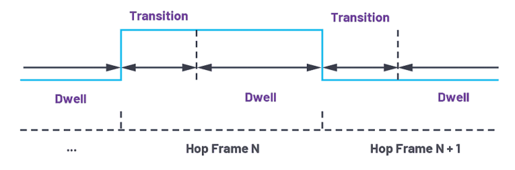 The ADRV9002 provides different FH modes based on PLL usage. Each time slot in Figure 1 stands for a hop frame, which is divided into a transition time period and a dwell time period, as shown in Figure 3.