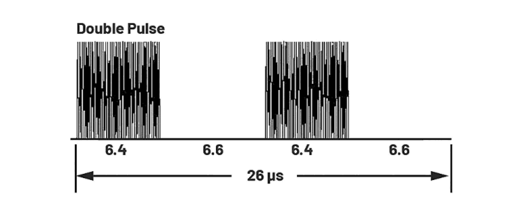 Link 16 message data can be sent as either a single pulse or a double pulse, depending on the packing structure. The single-pulse structure consists of a 6,4 µs on-time and a 6,6 µs off-time with a total duration of 13 µs. The double-pulse structure consists of two single pulses that carry the same data but use different carrier frequencies, as shown in Figure 5. Therefore, the transition time could be 6,6 µs long (>2 µs), which makes Link 16 FH feasible with the ADRV9002.