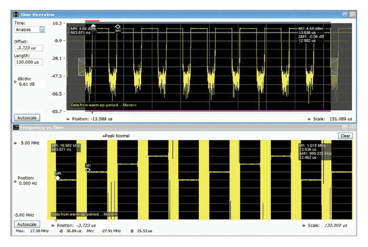 In this experiment, the transmit carrier frequency cycles through four different frequencies in a 1 MHz step size. As expected, the lower plot proves that the transmit output is also cycling through four different frequencies in a 1 MHz step size with good frequency accuracy throughout the entire dwell time.