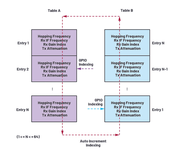 While one table is being used for the current hop frame, the other table is being loaded to prepare for the next hop frame. Each entry notifies the ADRV9002 of the configurations for a certain hop frame. A hop table can be indexed by either incrementing the index automatically (start from the first entry of the first table to the last entry of the second table and then go back to the first entry of the first table again with two hop tables or loop continuously with one hop table) or accessing a specific entry at any time indicated through digital GPIOs.
