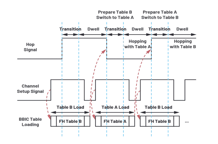 In addition to indicating the hop frame type, the channel setup signal can also be used to trigger the loading of a hop table initiated by the BBIC. The hop table loading should be completed before the hopping signal edge after the channel setup signal falling edge and then the PLL starts tuning to this frequency at the same hop edge and becomes ready for the next hop frame signalled by the next hop edge. Table A and Table B operate in a ping-pong mode so that, after loading is complete, FH operates on the frequency of one table while the frequency of the other table is being tuned.
