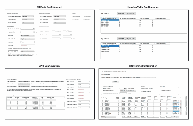 FH performance can be evaluated thoroughly through the ADRV9002 TES with an evaluation board – both the Xilinx ZC706 and ZCU102 FPGA boards are supported by TES. As shown in Figure 11, the FH configuration pages are easy to use to configure FH parameters, including FH operation mode, the hopping tables, the GPIO setting, the TDD timing, etc. FPGA synchronisation features are built into the TES to allow users to accurately control the TDD timing so that the transmit or receive frames can be fully synchronised with hop frames. Many FH examples are also provided in TES for users to further explore.