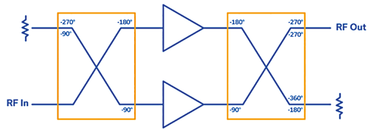 Quadrature hybrids have inherent -90° phase shifts for each leg traversed by a signal, whether used as a power splitter or as a combiner. An ideal quadrature hybrid will split the power of the RF input signal equally, applying half to each of two output ports, and delivering exactly zero power to the fourth, isolated port. Figure 1 shows a pair of amplifier devices nested between an input quadrature hybrid splitter and an output quadrature hybrid combiner. This entire circuit from RF In to RF Out is referred to as a balanced amplifier, or a quad-combined pair.