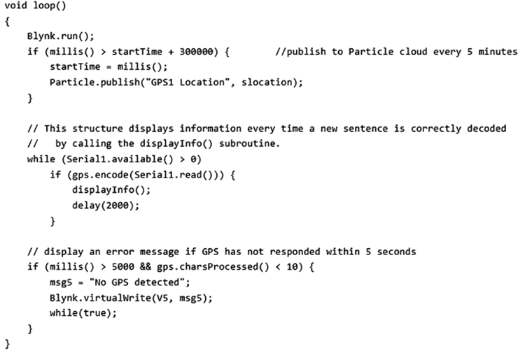 In the main routine, a timer routine was used to publish location data to the Particle cloud every 5 minutes. A routine called displayInfo() was called every time a new sentence sent by the GPS module was correctly decoded. If no GPS message was received within 5 seconds, an error message was displayed to that effect.