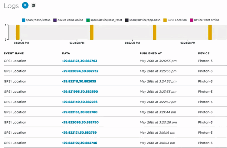 Figure 6 shows the logs displayed in the particle.io logging interface. Here the location data, date and time of publication and event name is displayed in a table. This data can easily be imported into a spreadsheet for analysis of historical position data.