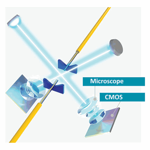 The fibre is placed within the optical path between LED light sources and CMOS detectors (Figure 1). Light, while passing through the side of the fibre on its way to the detectors, gets refracted and an image is created. Due to refraction, more light is accumulated at some points on the detector. We see some high light sections and some darker sections on the LCD display (digitally magnified a few hundred times).