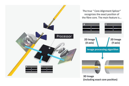 The fibres are aligned with sub-micron accuracy, based on the recognised core position. Fine-tuned V-grooves and micro movement mechanisms realise core alignment at the sub-micron level. Combined with real-time image processing, the world’s quickest and finest splice is achieved.