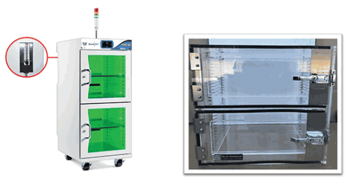 A nitrogen cabinet (Figure 2) is what often comes to mind when considering a desiccator cabinet. This is a clear, polyester or polycarbonate cabinet with connections for nitrogen drip or nitrogen purge functionality. These cabinets supply a continuous flow of nitrogen to maintain low humidity.