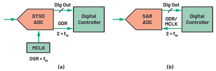For DTSD ADCs, the designer needs to plan for the provision of the high-frequency sampling clock for the core ADC and program the desired output data rate. The ADC will give a final digital output at this desired ODR and the ODR clock. A digital controller uses this ODR clock to clock in the data.