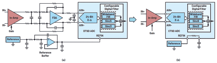 Figure 9 shows the building blocks of a traditional signal chain with an analog front end (AFE) comprising an ADC input driver, an alias rejection filter and a reference buffer that can be drastically simplified by a CTSD ADC. Figure 10a illustrates an example signal chain with a DTSD ADC that requires significant design effort to fine-tune and derive the data sheet performance of the ADC. To ease the customer journey, Analog Devices has reference designs that can be reused or retweaked for various applications for these ADCs.
