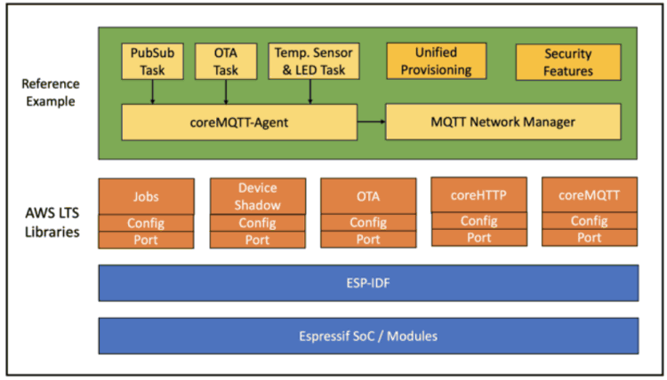 Restructuring the ESP-AWS-IoT SDK has provided the ability to use each AWS LTS library as a standalone ESP-IDF component that can easily be added to any example. Each library comes with its own port layer and configuration that can be easily managed for the application.