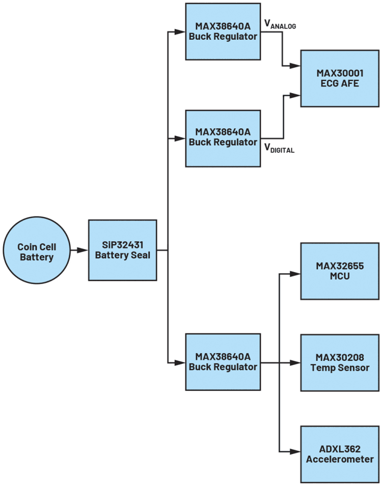 Designing an RPM, such as an ECG patch, poses multiple challenges for power supply designers. The design is typically space constrained and patches with several sensors may require multiple power rails. Because the RPM patch is usually intended to be a single-use item, a coin cell battery is typically the most cost-effective power source available to the designer. Using only a coin cell battery to supply power to the patch, a designer must be cognisant of the efficiency of the power supply subsystem.