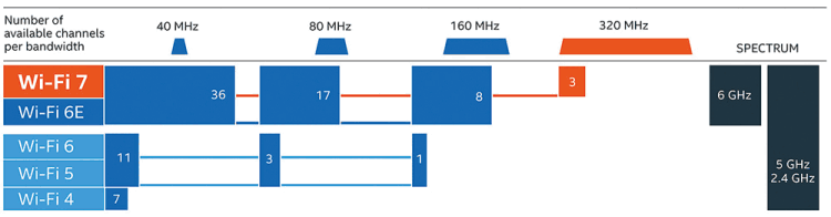 As shown in figure 1, Wi-Fi 7 doubles the available bandwidth, compared to Wi-Fi 6E. This is accomplished with three super-wide 320 MHz channels (compared to Wi-Fi 6’s 160 MHz channels) on the dedicated 6 GHz band while still using the existing channels on the legacy 5 and 2,4 GHz bands.