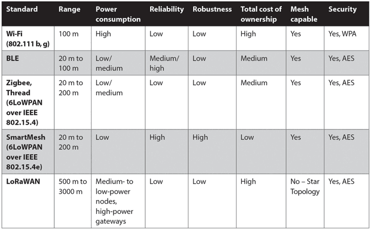 Figure 1 provides an overview of wireless standards, and Table 1 ranks selected wireless standards against key industrial requirements. It’s clear that BLE and SmartMesh (6LoWPAN over IEEE 802.15.4e) offer the best combination of low power consumption, reliability, and security for industrial applications. Thread and Zigbee offer low power and secure mesh implementations but score lower on reliability.