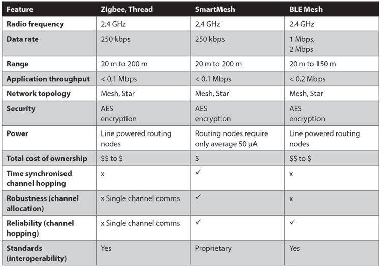 Table 2 provides more details for the Zigbee/Thread, SmartMesh, and BLE mesh standards. SmartMesh includes a time synchronised channel hopping (TSCH) protocol, where all nodes in a network are synchronised and communication is orchestrated by a schedule. Time synchronisation results in low power and channel hopping results in high reliability. The BLE standard also includes channel hopping, but has some constraints in comparison to SmartMesh, including line powered routing nodes (increasing system cost and power), and TSCH is not supported. As previously mentioned, Zigbee/Thread score low on reliability and do not offer many advantages compared to BLE.