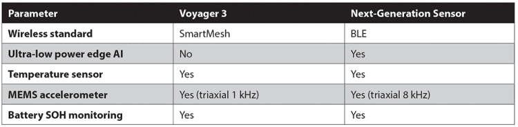 Table 3 provides an overview of Analog Devices’ Voyager 3 Wireless Vibration Monitoring Platform and next-generation wireless condition monitoring sensors. Voyager 3 uses a SmartMesh module (LTP5901-IPC). An AI-enabled vibration sensor (still in development) uses a BLE microcontroller (MAX32666). Both sensors include temperature and battery state of health (SOH) sensors. The Voyager 3 and AI version sensors use ADI MEMS accelerometers (ADXL356, ADXL359) to measure vibration amplitude and frequency for industrial equipment. Increasing vibration amplitudes and frequencies are identified using FFT spectra, which can indicate faults such as motor imbalance, misalignment, and damaged bearings.