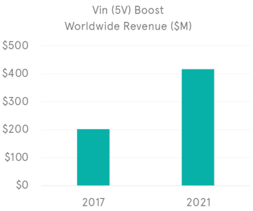 Boost converters are DC-to-DC converters whose output voltage is greater than that of the source voltage. Looking at the boost converter market, VIN (5 V) boost power management circuits are the fastest growing segment, according to industry analysts (Figure 3 shows revenue projections for the global boost converter market).