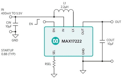 Maxim now offers boost (step-up) DC-to-DC converters with ultra-low quiescent current (300 nA) and True Shutdown technology, ideal for battery-powered applications that require long battery life. The MAX17222 nanoPower boost regulator features a 225 mA/0,5 A/1 A peak inductor current limit (Figure 4).