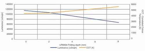 The graph in Figure 1 shows how the potting depth of UR5634 affects the colour temperature shift.