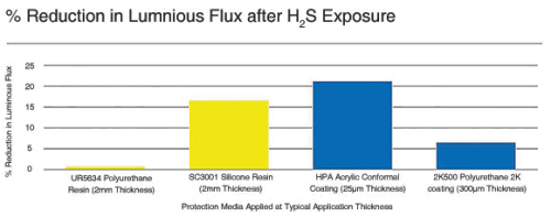 The compromise between potting depth (and therefore the degree of protection achieved) and colour temperature shift is a critical one. In the first instance, the level of protection can be controlled by the material type or chemistry used; a standard conformal coating, for example, will offer a base level of protection against humidity, salt mist, etc. Next, a thicker two-part coating can be applied to provide enhanced protection against condensation and (if present) corrosive gases. Finally, an encapsulation resin may be applied and its thickness adjusted to achieve the desired level of protection. Figure 2 shows an example of the protection provided by these three material layers in a corrosive gas environment. Let’s now consider other exciting new applications for LED lighting and the protection challenges these pose for the designer.