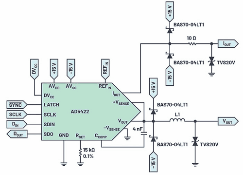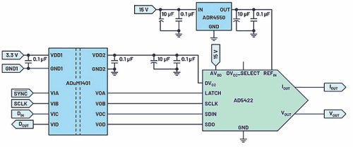 Figure 1 shows an example circuit for fully isolated control of an analog output stage of an output module. It is especially suitable for PLCs and DCS modules in process control applications requiring standard current outputs of 4 mA to 20 mA and unipolar or bipolar output voltage ranges. The AD5422 is used here in combination with the ADuM1401 quad-channel digital isolation module.