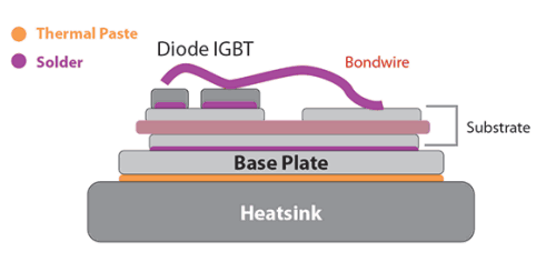 IGBTs are widely used in power electronics and provide a good example for understanding the effects of pump-out. They consist of a thermal stack (Figure 1), which includes materials of differing coefficients of thermal expansion (CTEs) and a variety of bulk thermal conductivities, leading to temperature gradients throughout the IGBT.