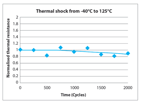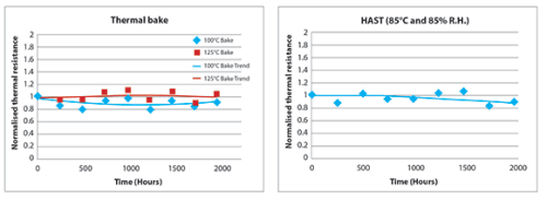 As the application requirements govern the expected environmental conditions, it is typical to see a range of testing conducted in line with the application, rather than a standard set of conditions. Such testing is usually conducted within similar frameworks, illustrating the thermal stability of the TIM after temperature cycling, high-temperature bake and HAST (highly accelerated stress testing), and utilise thermal resistance values as an indication of stability. As can be seen from the graphs in Figure 4, this accelerated testing provides a greater understanding of the lifetime of a TIM when compared to standard power cycle tests conducted under the exact conditions of use.