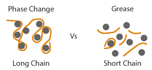 A phase change material alters its state from a solid to a softer material above a set temperature, usually around the 50°C range. This function is achieved by using a polymeric material, rather than a base oil, as the basis of the TIM formulation (Figure 5). The polymer chains provide enhanced stability of thermal filler dispersion in both the solid and softened state. This results in enhanced thermal conductivity and long-term, low thermal resistances, as the material is kept in a more consistent state throughout its lifetime in the device. Thermal pastes, on the other hand, are comprised of base oils with shorter molecular chains, offering excellent wetting for initial application but possibly leading to issues including pump-out, drying out and oil bleeding over time.
