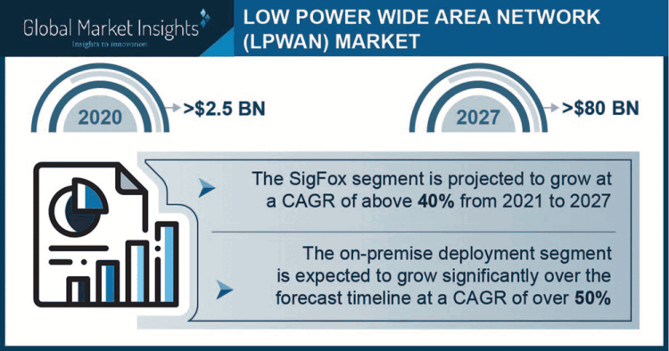 Global market research therefore needs to be taken with a pinch of salt, but it can give us a preview of what to expect when we do finally board the bandwagon. Per a February 2021 Global Market Insights report (see infographic in Figure 1), the market valuation for LPWAN is expected to cross $80 billion by 2027. The growing popularity of dedicated M2M communication networks, such as NB-IoT and LTE-M, is expected to contribute significantly to the market growth.