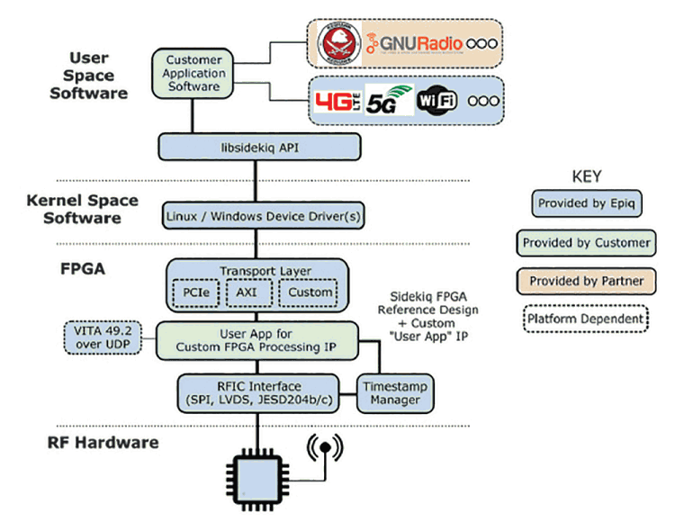 Once the steps are taken to create a flexible RF frontend with baseband A/D and D/A converters that interface to an FPGA with a high-speed transport up to a CPU, the real programming fun with the software stack can begin. There are multiple layers of software required as part of the SDR infrastructure to make this type of system work. An example software/FPGA stack is shown in Figure 2, based on Epiq Solutions’ SDR portfolio.