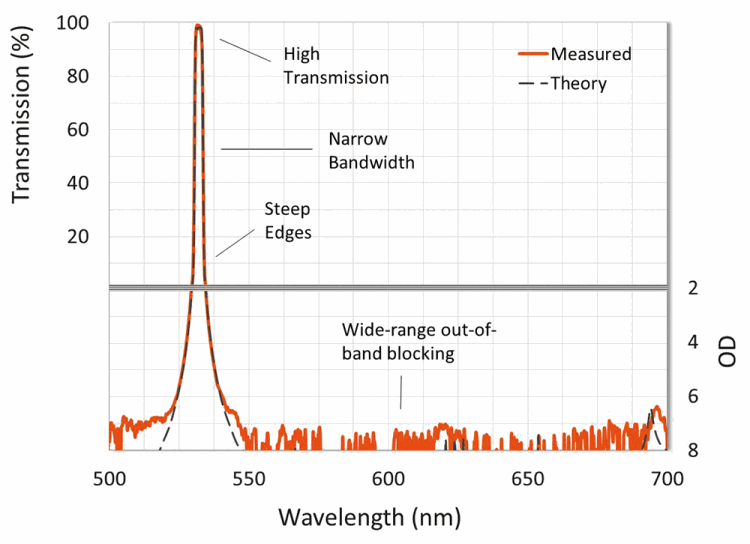 Because of the precise nature of LIDAR return signals, most LIDAR filters are ultra-narrowband thin-film interference filters. These filters must be able to achieve both high transmission over an ultra-narrow bandwidth to isolate the return signal, and deep out-of-band blocking over a large wavelength range to attenuate sunlight and other extraneous light (Figure 3). However, there are many different types of LIDAR systems that each necessarily demand application-specific filter requirements to maximise signal-to-noise ratios.