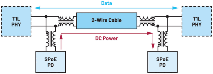 Like PoE, SPoE can be used for both data and power transmission. This is significant, because remote electronics usually need power and data connectivity. Figure 1 shows this with the T1L PHY blocks.