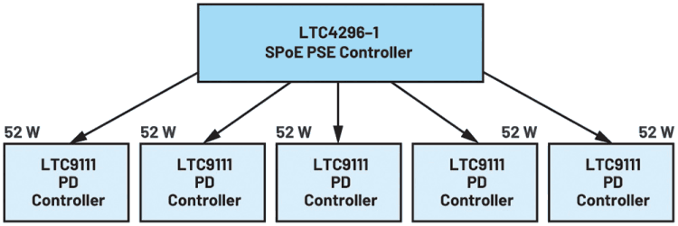 PSE controllers are often designed for multiple channels (cables). This is significant for systems that power multiple remote machinery (that is, sensors). The LTC4296-1 from Analog Devices, for example, can supply up to five loads of energy (Figure 2). Each supply line can be up to 1000 m long.