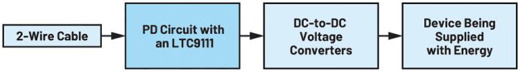 Figure 3 shows a block diagram of a PD receiver circuit with an LTC9111. The energy comes from the two-wire cable. The PD circuit takes care of the classification and monitoring of the line transmission, with the classification specifying the power class that the energy transmission will operate in. If the operated electrical device needs a voltage other than 24 or 55 V, an additional DC-to-DC converter is used.
