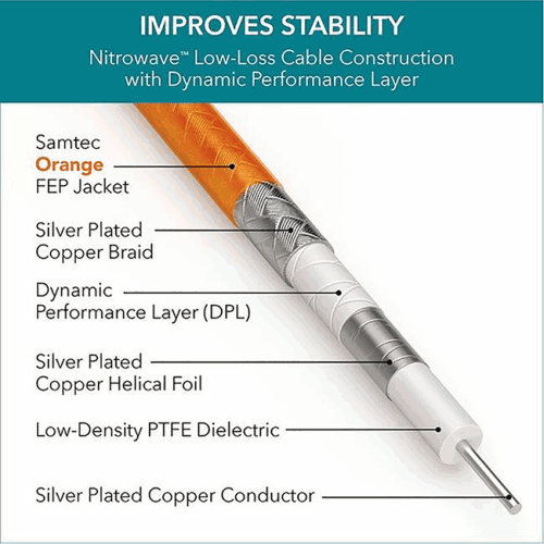 Samtec’s NITROWAVE is a range of high-performance RF cables designed for microwave and millimetre wave (mmWave) applications. In common with many coaxial cables, NITROWAVE uses silver-plated copper as the material for both the foil and braid, with an FEP (Fluorinated ethylene propylene) jacket in Samtec’s signature orange colour to provide protection in some of the toughest conditions. Designed for demanding applications in the aerospace and defence markets, along with instrumentation and computing industries, the FEP jacket delivers a high working temperature and resistance to abrasion.