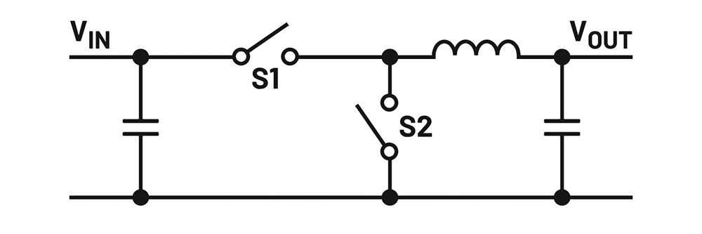 In Figure 1, the two switches, S1 and S2, are mainly responsible for the maximum possible input voltage range. However, the corresponding driver in a voltage converter IC must also be able to generate the high gate voltage required for the S1 switch. This voltage is the sum of the maximum supply voltage plus the threshold voltage required for the MOSFET. Thus, in addition to the MOSFET, the voltage converter IC must also be selected accordingly.
