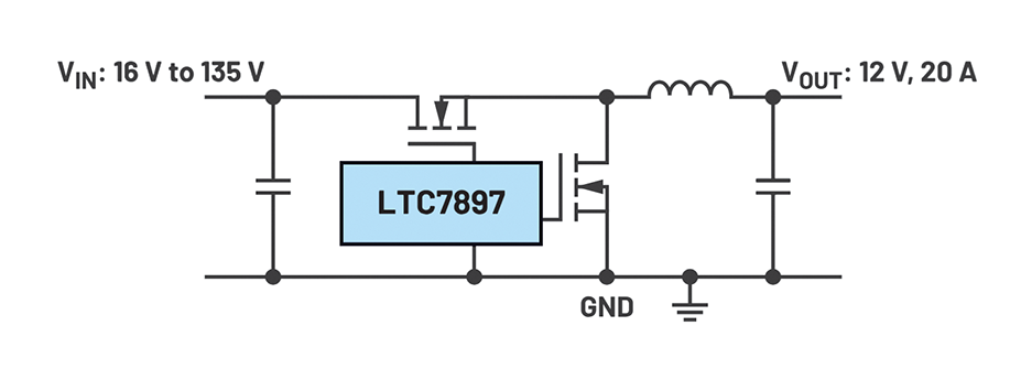 Figure 2 shows the LTC7897 controller IC from Analog Devices, which is designed for a supply voltage of up to 135 V (140 V abs max). The output voltage can also be very high when using this IC – up to 135 V as long as it is lower than the input voltage.