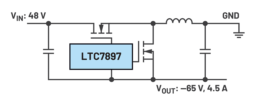 Figure 3 shows the LTC7897 in the inverting topology to convert from a 48 V supply voltage to a -65 V output voltage.