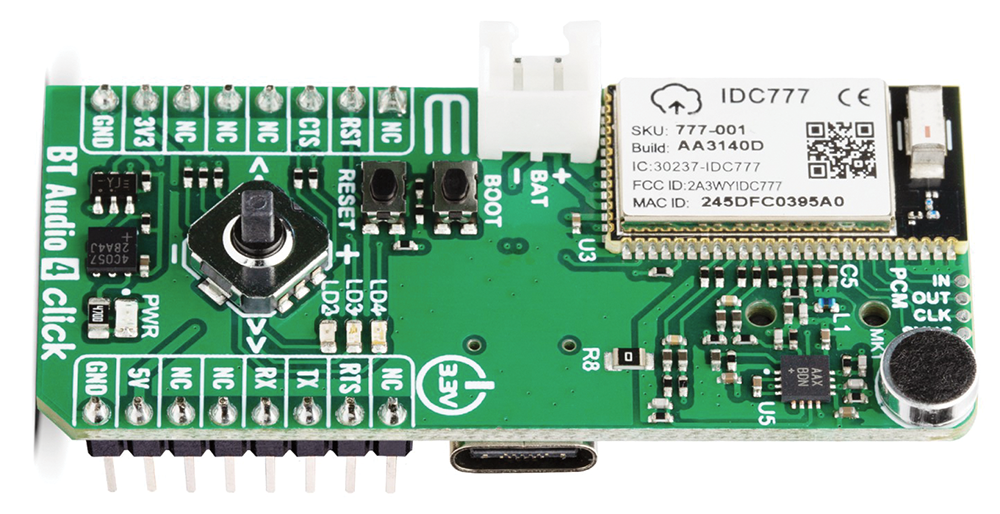 BT Audio 4 Click is a compact add-on board from MIKROE, designed to provide high-quality wireless audio streaming and data communications over Bluetooth in both Classic and LE Audio modes. This Click board is based on the IDC777-1, a fully integrated Bluetooth 5.4 module from Cambridge UK-based IOT747, which supports LE Audio Unicast and Auracast, controlled via UART.
