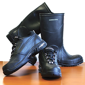 Eliminating static charge build-up in rugged working areas is crucial to prevent ESD damage. Grounding systems are used to ensure that all components, personnel and any other conductors are at the same electrical potential. Conductive ESD boots are used in conjunction with other grounding devices, such as a wrist strap, cord, and ESD surface mats, to provide a continuous path to ground to dissipate any static. ESD footwear or foot grounders should be worn on both feet to ensure constant contact with the floor.