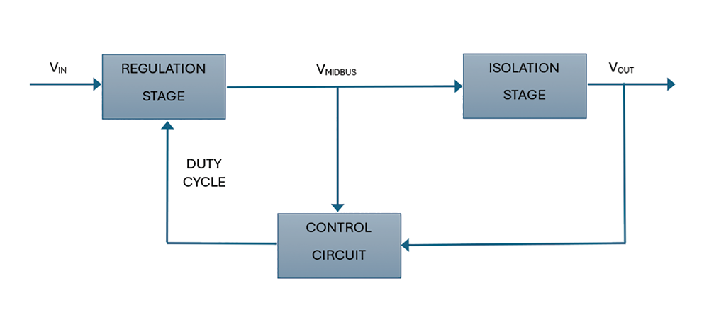The advantage of this two-stage design is that only the first stage sees the wide range of the input voltage. While a penalty for the wide range must be paid for by this first stage, it is not so severe because the first stage does not require an isolation transformer. The isolation stage, which does have the transformer, never experiences the wide input voltage range. In this two-stage design, the input voltage – the mid-bus voltage of the two-stage approach – is always constant. This permits the isolation stage to be optimised for a single operating condition, and it makes it much easier to implement a design based on synchronous rectifiers, which greatly reduces losses. The resulting increase of efficiency in the isolation stage goes a long way toward making up for any additional losses that occur in the regulation stage