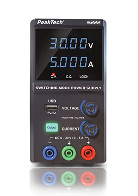 The PeakTech P 6222 is the company’s new, slim laboratory power supply that offers precisely adjustable output values of 30 V and 5 A with a continuous power output of 150W. This makes it ideal for use in laboratories, workshops, and development environments.